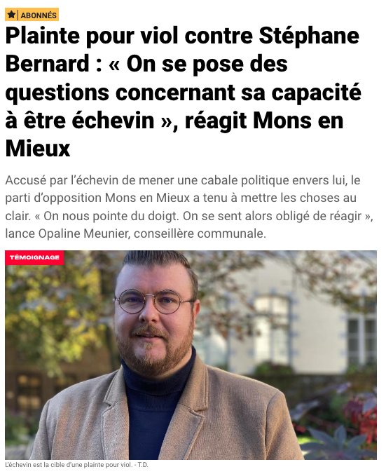 Plainte pour viol contre stéphane Bernard : "On se pose des questions concernant sa capacité à être échevin", réagit Mons en Mieux