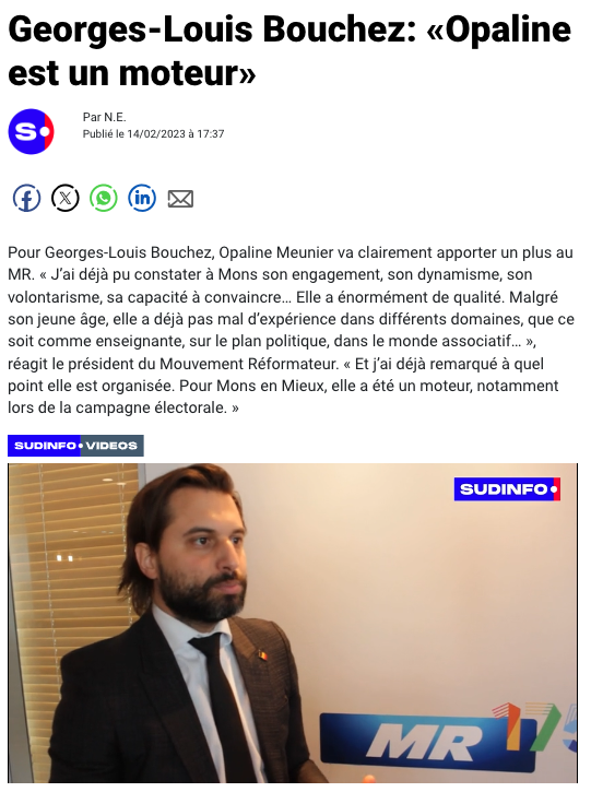 Pour Georges-Louis Bouchez, Opaline Meunier va clairement apporter un plus au MR. « J’ai déjà pu constater à Mons son engagement, son dynamisme, son volontarisme, sa capacité à convaincre… Elle a énormément de qualité. Malgré son jeune âge, elle a déjà pas mal d’expérience dans différents domaines, que ce soit comme enseignante, sur le plan politique, dans le monde associatif… », réagit le président du Mouvement Réformateur. « Et j’ai déjà remarqué à quel point elle est organisée. Pour Mons en Mieux, elle a été un moteur, notamment lors de la campagne électorale. »