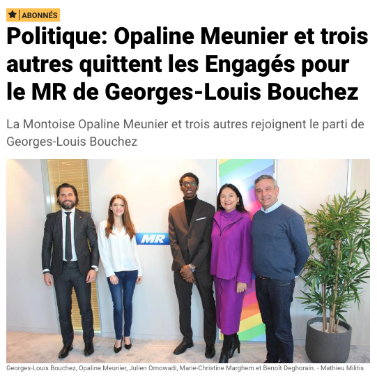 Politique : Opaline Meunier et trois autres quittent les Engagés pour le MR de Georges-Louis BOUCHEZ