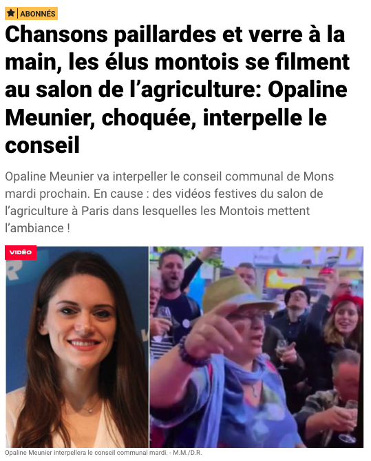 Opaline Meunier va interpeller le conseil communal de Mons mardi prochain. En cause : des vidéos festives du salon de l’agriculture à Paris dans lesquelles les Montois mettent l’ambiance !