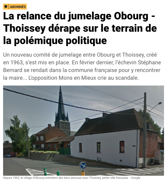 Un nouveau comité de jumelage entre Obourg et Thoissey, créé en 1963, s’est mis en place. En février dernier, l’échevin Stéphane Bernard se rendait dans la commune française pour y rencontrer la maire... L’opposition Mons en Mieux crie au scandale..