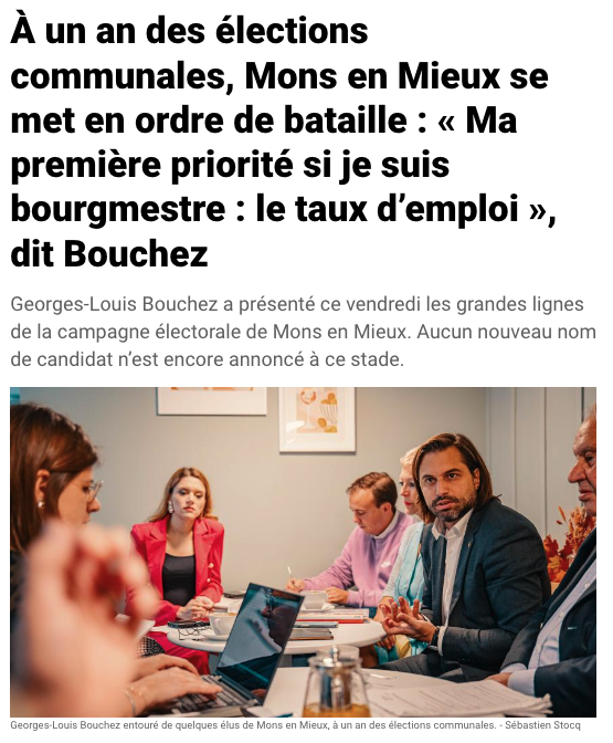 A un an des élections communales, Mons en Mieux se met en ordre de bataille : "Ma premiere priorité si je suis bourgmestre, le taux d'emploi ", dit Bouchez