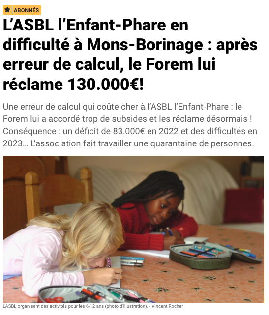 Une erreur de calcul qui coûte cher à l’ASBL l’Enfant-Phare : le Forem lui a accordé trop de subsides et les réclame désormais ! Conséquence : un déficit de 83.000€ en 2022 et des difficultés en 2023… L’association fait travailler une quarantaine de personnes.