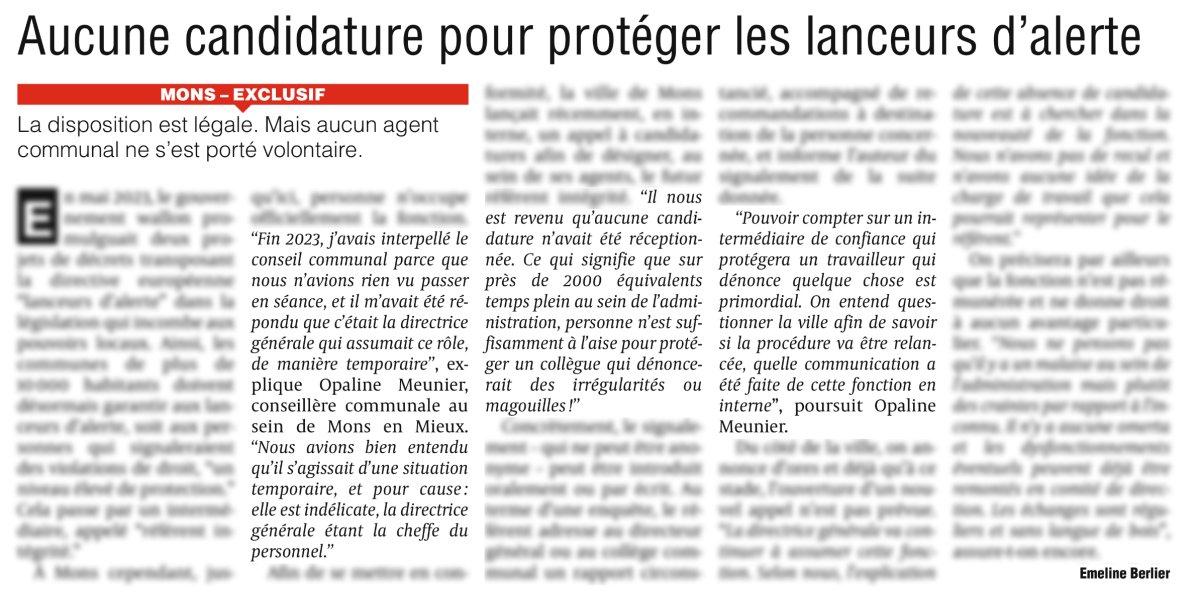 « Pouvoir compter sur un intermédiaire de confiance qui protégera un travailleur qui dénonce quelque chose est primordial au sein des services publics et on regrette que personne ne se soit manifesté pour assumer cette responsabilité. On entend questionner la ville afin de savoir si la procédure va être relancée, quelle communication et quelle pédagogie ont été proposées autour de la fonction en interne », poursuit Opaline Meunier.