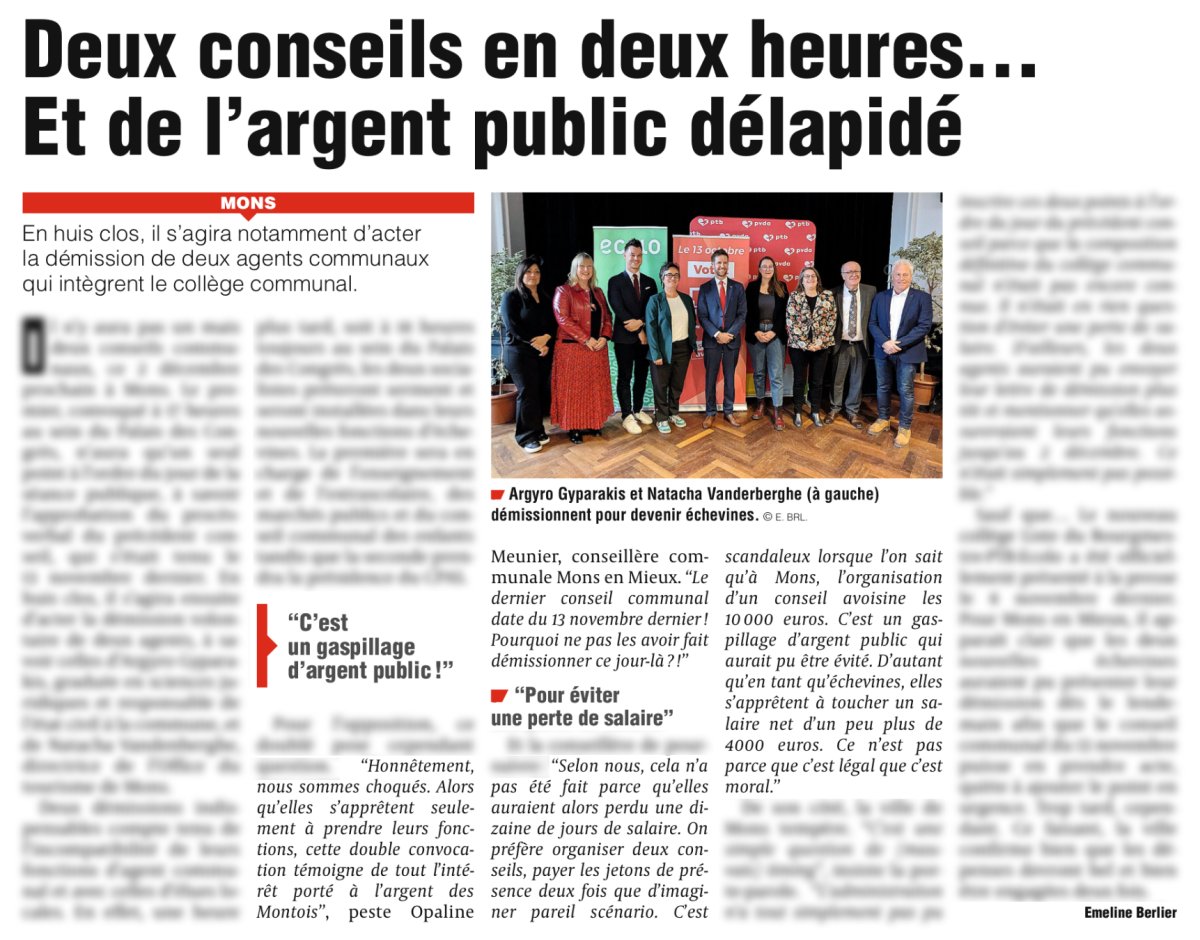 Pour Opaline Meunier, conseillère communale de l'opposition on aurait pu acter la démission des deux dames lors du dernier conseil communal qui s'est tenu le mercredi 13 novembre. « Les noms d'Argyro Gyparakis et de Natacha Vandenberghe pour occuper de nouvelles fonctions étaient déjà connus avant le conseil communal du 13 novembre, elles auraient donc pu démissionner ce jour-là », argumente Opaline Meunier. « La preuve, le nouveau collège communal a été présenté à la presse le 8 novembre ! ». Pour Mons en Mieux, si les deux démissions avaient été actées le 13 novembre, les deux élues PS auraient perdu leur salaire jusqu'à la prise de leurs nouvelles fonctions le le 2 décembre...