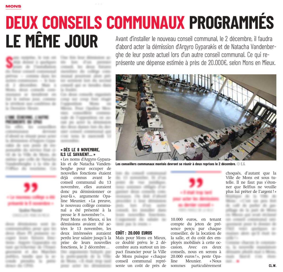 « Honnêtement nous sommes choqués. Alors qu'elles s'apprêtent seulement à prendre leurs fonctions, cette double convocation témoigne de tout l'intérêt porté à l'argent des Montois", peste Opaline Meunier conseillère communale Mons en Mieux. « Le dernier conseil communal date du 13 novembre dernier ! Pourquoi ne pas les avoir fait démissionner ce jour-là ? ! »