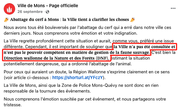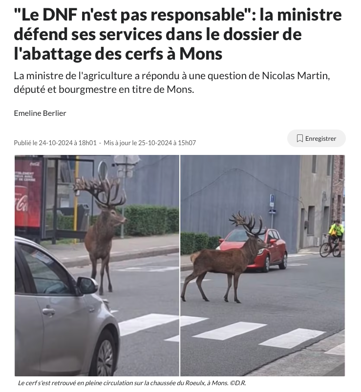 Commentaires : En réponse au Parlement Wallon, la Ministre de l'environnement Anne-Catherine Dalcq a précisé que la Direction Nature et Foret n'a pas donné la consigne d'abattre le cerf à Saint-Symphorien, mais que la décision a été prise par le police, contrairement à ce que la Ville de Mons affirmait (voir ci-dessous)