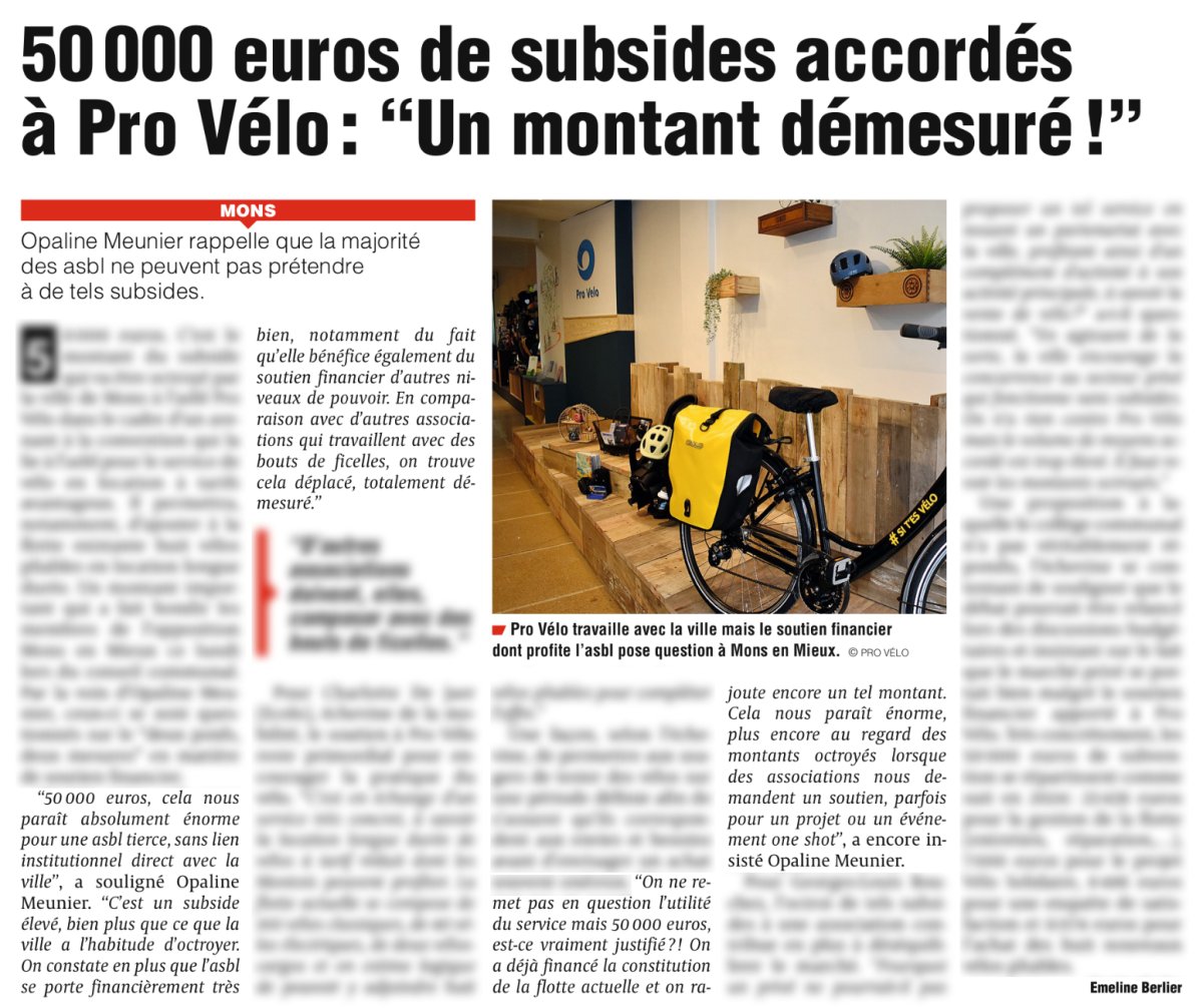 « 50 000 euros, cela nous paraît absolument énorme pour une asbl tierce, sans lien institutionnel direct avec la ville", a souligné Opaline Meunier. "C'est un subside élevé, bien plus que ce que la ville a l'habitude d'octroyer. On constate en plus que l'asbl se porte financièrement très bien, notamment du fait qu'elle bénéfice également du soutien financier d'autres niveaux de pouvoir. En comparaison avec d'autres associations qui travaillent avec des bouts de ficelles, on trouve cela déplacé, totalement démesuré. » ... « "On ne remet pas en question l'utilité du service mais 50 000 euros, est-ce vraiment justifié ? ! On a déjà financé la constitution de la flotte actuelle et on rajoute encore un tel montant. Cela nous parait et énorme, plus encore au regard des montants octroyés lorsque des associations nous demandent un soutien, parfois pour un projet ou un événement one shot », a encore insisté Opaline Meunier.