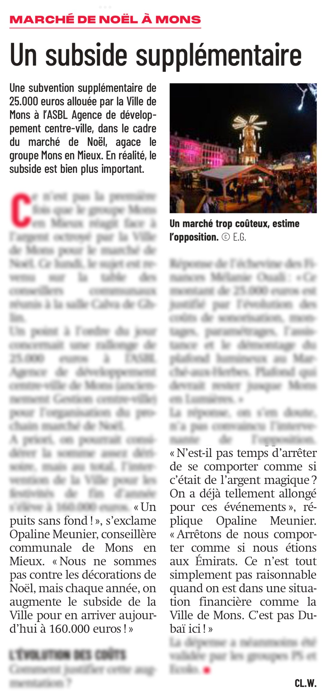 « Un puits sans fond ! », s'exclame Opaline Meunier conseillère communale de Mons en Mieux. « Nous ne sommes pas contre les décorations de Noël, mais chaque année, on augmente le subside de Ville pour en arriver aujourd'hui à 160.000 euros ! » ... « Arrêtons de nous comporter comme si nous étions aux Émirats. Ce n'est tout simplement pas raisonnable quand on est dans une situation financière comme la Ville de Mons. C'est pas Dubaï ici ! »