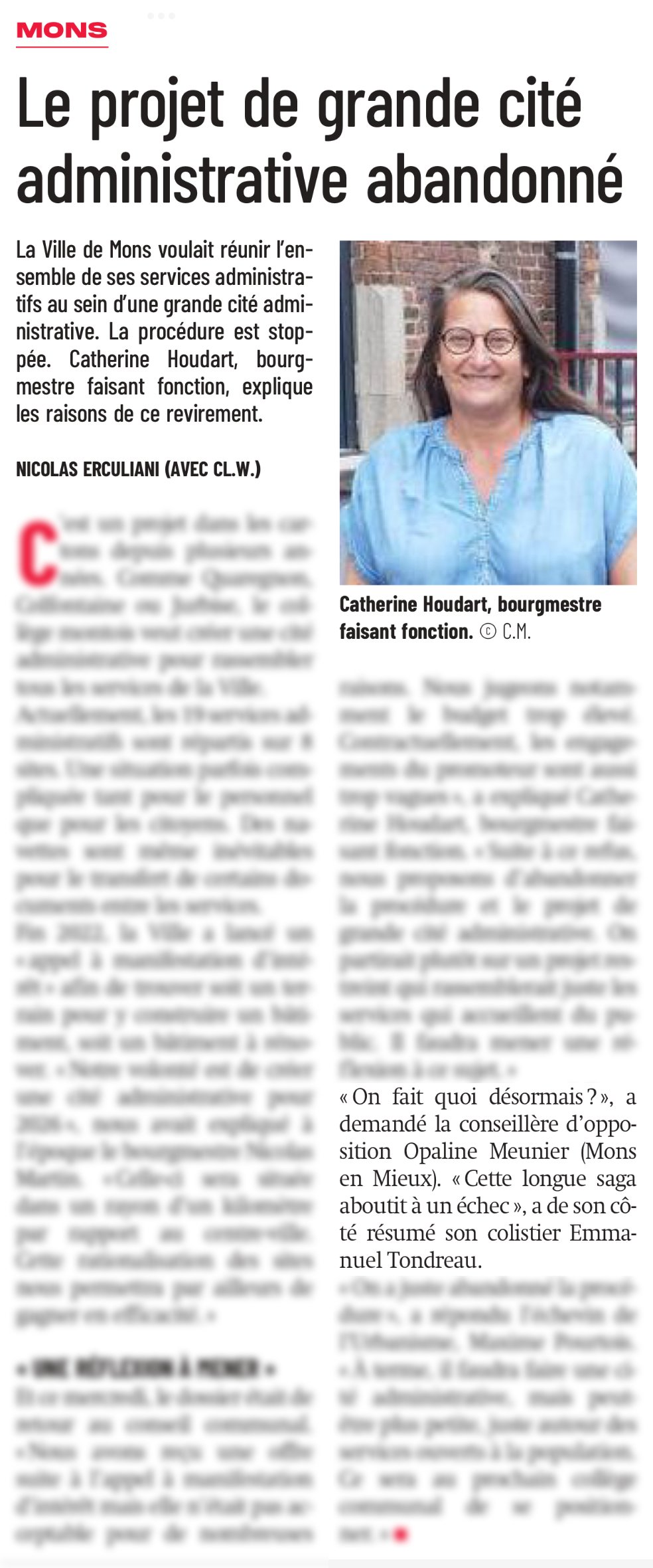 La Ville de Mons voulait réunir l'ensemble de ses services administratifs au sein d'une grande cité administrative. La procédure est stoppée. Catherine Houdart, bourgmestre faisant fonction, explique les raisons de ce revirement